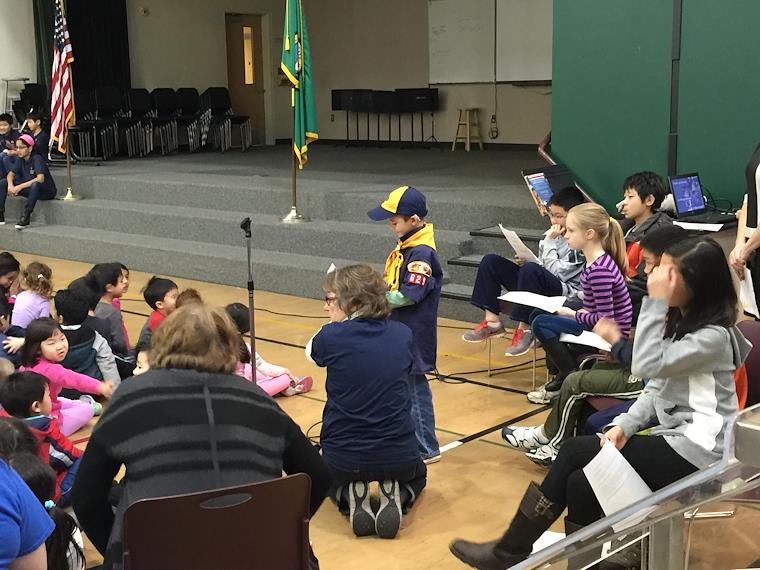 Peter doing the pledge of allegiance in cub scout uniform at school