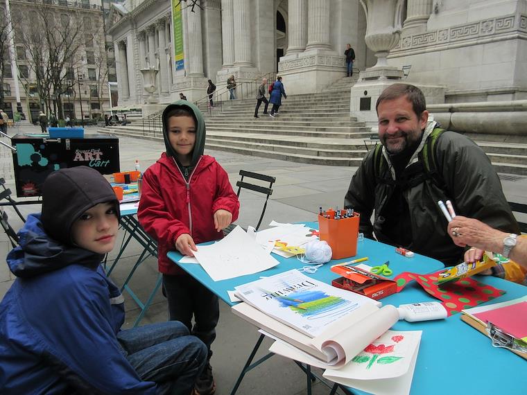 At the New York Public Library, there was a roving art cart for kids, where Peter made lots of things.