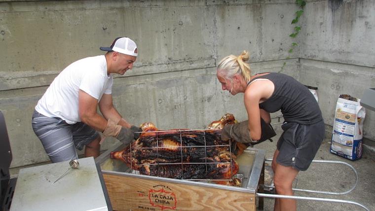 We were at the pool for Peter's birthday party, and there was also a pig roast going on! Here's the pig being flipped over.