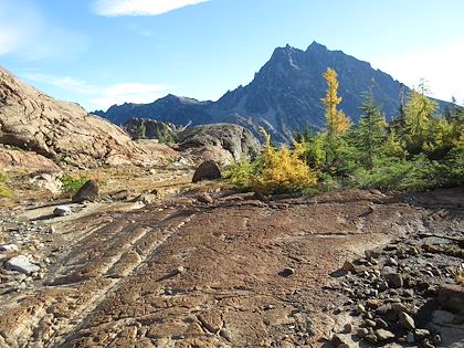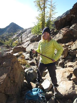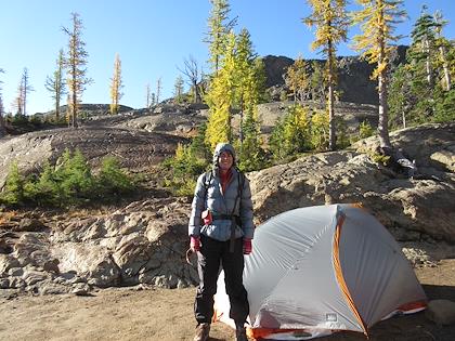 | The larches were turning yellow, and apparently in about 2 weeks will be a bright orange | | Our tent survived the night fairly well, despite the heavy winds and rain |