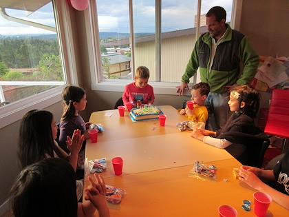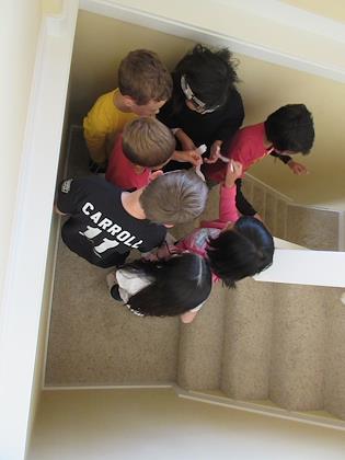 |  | |  | | Peter's 9th birthday party! | | Doing the treasure hunt. The clue was "What goes up and down, but stays in one place?" It took them about a microsecond to figure it out, and another to actually find the clue. They finished a lot faster than I thought they would! |