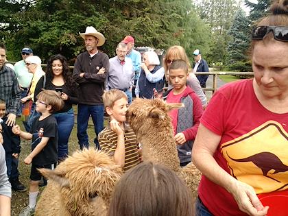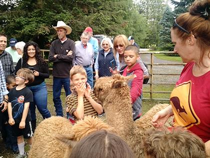 Peter feeds a llama by letting it take a pellet from his mouth