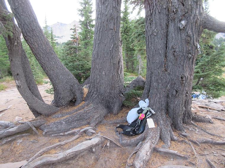 My pack, sitting on top of pine needles against the trees to try to avoid the ever-present dust