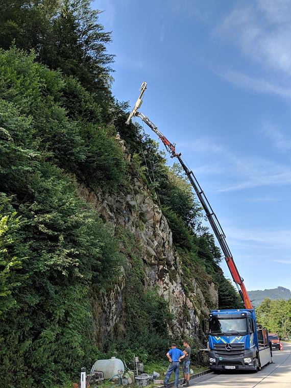 I think this road crew was removing potentially dangerous boulders - one of the trucks said "sprenngstoff" (explosives)