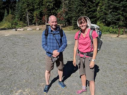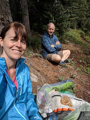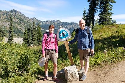 |  | |  | | "Trail angels" at Chinook pass - this couple drives up here frequently to give food to thru-hikers. They offered peaches and muffins, among other goodies. We didn't partake, since we weren't thru-hikers. | | Chinook pass and the end of the trail for us | | | | | | | | | | | |