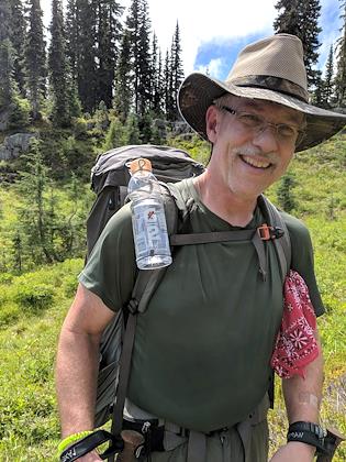 |  | |  | | This hiker had an interesting method of attaching his water bottle to his shoulder strap via elastic bands | |