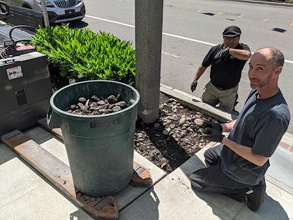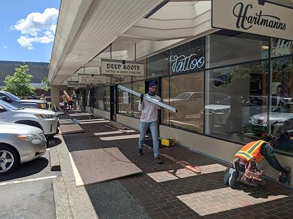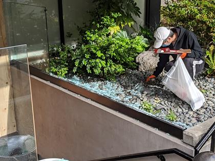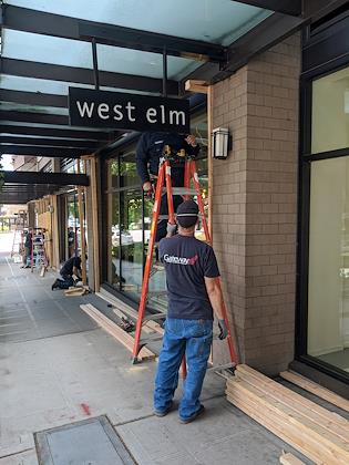 A shop owner picking out ornamental rocks from the walk in front of his place, for fear they would be used to break his windowsBoarding up the West Elm