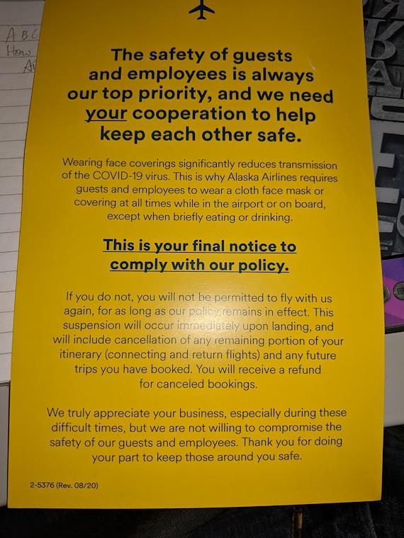 On the way home, we got a Yellow Card on Alaska Air, because Peter had his mask under his nose.