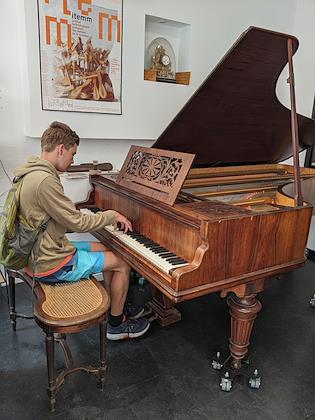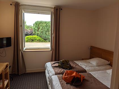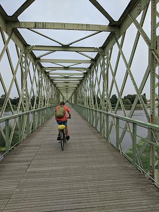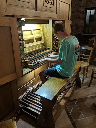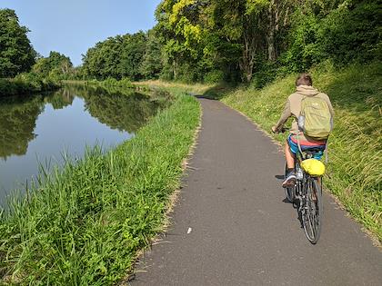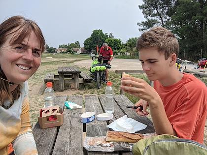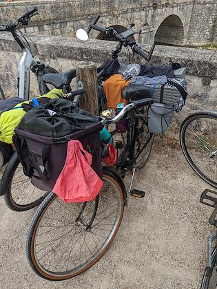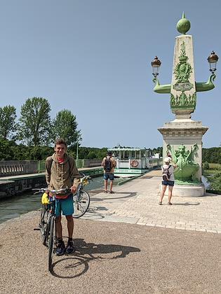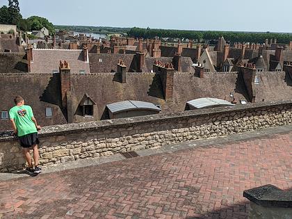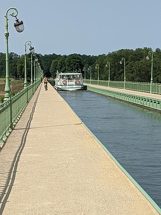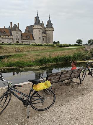 June 28, 2023 - Rogny-les-Sept-Écluses to Gien It was chilly overnight, good thing we had the heater, but even with that it was a little bit cold. This morning I got up and put quite a bit of effort into tidying the tent, sweeping up the floor, folding up the bed linens, etc., because they took a 250 euro deposit and I wanted to get it all back. Turned out to be not a problem. We then biked down the road a little bit to the bakery, got some bread and some pastries (fruit tart) for breakfast since it's Peter's 16th birthday! We stopped at the bottom of the locks and had breakfast. Today's biking started out over to the top of the watershed, and then after that all the locks went downhill. There were some very long quiet stretches, with nothing to see, so I ended up spending a lot of time sitting on that bike seat without breaks, which gets painful after a while, there were 2 spots on my bottom that felt like they were bone-on-seat. Breaks are really quite necessary.  | | Some photos from the canal on the way to Briare |  | | Old roof tiles, also a sign for an old walking path, no longer maintained |  | | I took a LOT of this type of photo - Peter, ahead of me on the trail. | Briare was very nice, there was a very friendly tourist office, a beautiful church with very interesting mosaics, and also what a miracle, Peter found a piano restoration workshop, and the owner let him play on one of the pianos that was in the process of being restored! We had a long conversation, apparently he has more than 200 antique pianos that he hopes to restore.  | | The piano restorer's workshop | And then finally we saw the Loire! It's very impressive how wide it is, after the narrow little canals. We biked over the canal bridge. It didn't really sink in until we were halfway across, that it is specifically to bring the canal to the other side, over the river. And boats go across it, to get to the canal system on the other side. Amazing. I wonder how many of that kind of bridge exist in the world.  | | The high levees along the Loire. Often the bike trail was built on them. |  | | Hauling our bikes up to get on the bridge |  | | The "Pont Canal" (canal bridge, in other words, a bridge for the canal to go over the Loire) |  | | This gives you a good sense that it's actually a bridge for a canal |  | | The first Loire a Velo sign |  | | Lots of old wells like this |  | | Getting close to Gien | So now we're on a different bike trail system entirely, the Loire a Velo. It's older, and has less dedicated bike paths so far. In Gien we're in a not very highly rated hotel, but it's quiet and convenient, and they let you in at 1, which is very early for France. We're only here one night, so it's fine. We hung out a bit at the hotel and then walked into town, up to the cathedral where Peter got to play the organ! There was a couple at the cathedral when we arrived, working on tuning up the organ, apparently they need to be tuned quite frequently in hot damp weather. They were very friendly and welcoming. Later on in the evening after a lot of research on restaurants, we just went down the main road by the river, and stopped at the first restaurant that had some other clients and looked reasonable. Peter and I both had ground horse meat steaks, with an egg on top, and salad. It was quite tasty. The big excitement of the evening was that a car with four teens in it went by spraying people with a water gun, they got me twice. The owner of the restaurant ran out and yelled at them and called the police, though the police didn't come. Later on we went to the large supermarket on the edge of town. It was a little sketchy and and run-down looking, with people long-term parking in the parking lot. Peter stayed out in the parking lot to watch the bikes, even though they were locked, since it seemed like a sketchy area. Then he came in, worried that I was taking too long.  | | Peter got to play an organ |  | | Rooftops of Gien, from the cathedral plaza | June 29, 2023 - Gien to Saint-Benoît-sur-Loire The breakfast buffet was a little skimpy this morning, but I made it work. Peter had a hard time getting up, and I thought he was actually a little bit sick. He stayed behind me for much of the morning, when normally he's ahead of me, and only occasionally checking to make sure that I'm following him. But then he perked up later on in the day. I think it's just because of the early morning rising. Maybe tomorrow he can sleep in till at least 9:00 or so. The first part of the day was, honestly, a little bit boring. Long straight roads, lots of farmland. Wheat harvesting is ongoing. But then we stopped at the Chateau de Sully for a picnic, and also took the tour. Quite impressive. The most interesting part of the day was the Abby of Saint-Benoît-sur-Loire. It's an active Benedictine monastery, fascinating. We've been to two services so far today, they happen every few hours. There are mostly monks, but there's also some nuns as well. Interesting that the nuns seem to all be dressed in different garb, different colors, different lengths, different types of hair coverings. It would have been great to have a photo of the monks, but it didn't seem respectful. There were also quite a few men who seemed like they were not yet monks, they didn't have the robes, although they wore a shirt that was very much like the top half of a robe. There's only one restaurant in town that's open tonight, and it's a super fancy expensive one, so we just bought some things from the bakery, and some fruit from the epicerie, and will make dinner from that. Tomorrow we're heading to an apartment in Orlean, I look forward to actually cooking a little bit. Something very simple like scrambled eggs would be great. The hotel is very quiet, not busy at all, and far away from any traffic. It feels very peaceful and calming. Probably also because of the abby. We were on the first floor, Peter always jumped out of the window instead of going in and out through the