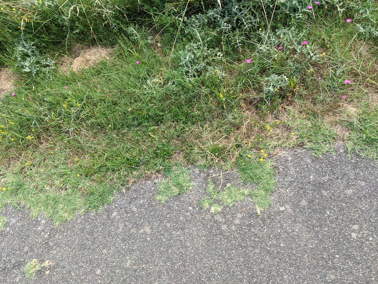 This new-looking trail pavement is probably missing some layer that prevents the weeds from coming through