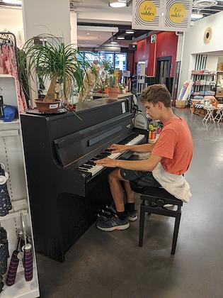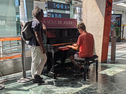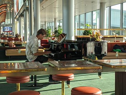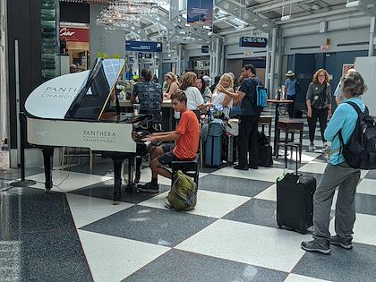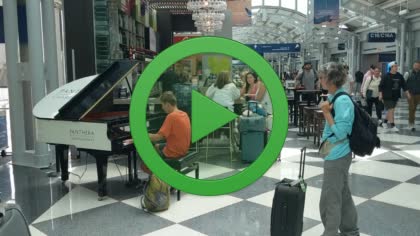 - At the airport in Chicago, Peter found ANOTHER piano. This one was right next to a bar, and after he sat down and played a bit, the bartender started a donation jar for him. He collected $36! Very impressive.