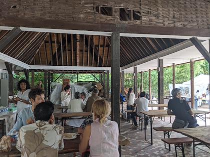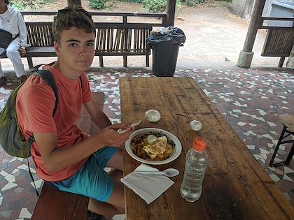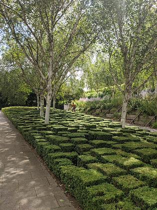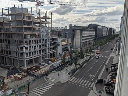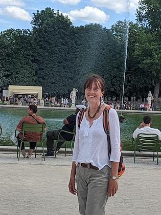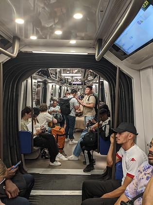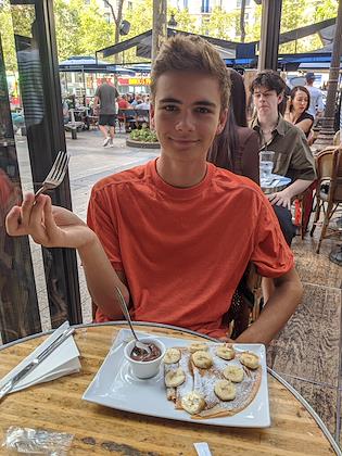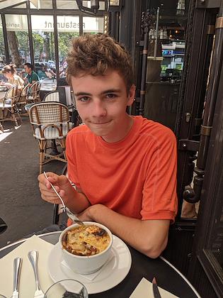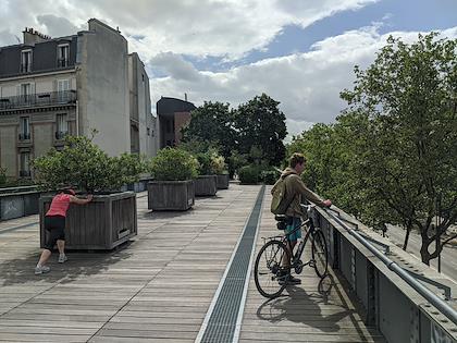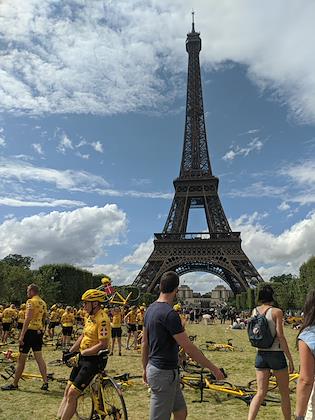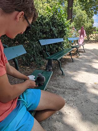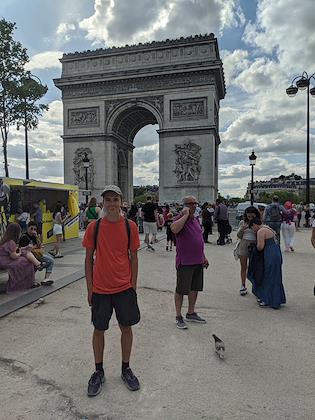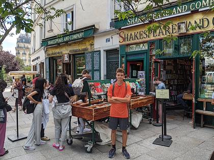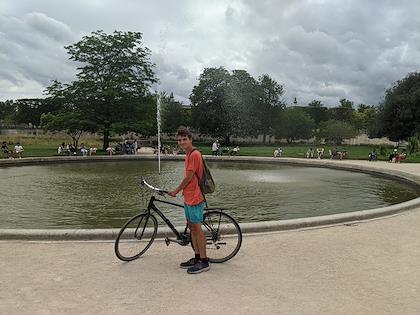 July 14, 2023 - From Nantes to Paris, and the end of the trip I let Peter sleep in today because our train was at 1:00, and we didn't have a whole lot going on before then. We had breakfast in the room (the breakfast at the hotel was overpriced) and then wondered about town a bit, and sat and hung out at a coffee shop. We got to the train station early because Peter wanted to play the piano. After a crazy homeless person who was banging on the piano left, he played for about an hour before we had to leave and get on our train. Another kid his age came up and sang along while Peter played. Getting on the train, and getting the bikes on the train was pretty straightforward. There was only one other person in our compartment, and they were lots of employees around who were helpful with the bikes. Unfortunately our seats were facing away from the direction of travel, which was a little disconcerting. Also many times you couldn't actually see the countryside, because there were so many trees right next to the train tracks. But overall it was very good. I keep on thinking about those two German guys that we met, who said they couldn't get tickets with bikes on a fast train, to get back to Germany, so they were taking a full THREE days to get back to Germany, arriving the third day at 9:00 p.m. at night. Either they were very unlucky, or we were very lucky. In Paris - biking from the train station (Montparnasse) to the hotel, on the left bank, was supposed to take 22 minutes according to Google maps. Of course it took us much longer, what with trying to figure things out, and work our way through traffic. But overall everything went okay, a little stressful. The hotel is the same brand as we had in Nantes, the Apart City, which has a tiny little kitchenette. It's nothing fancy, but not too far from the neighborhood we were in before, which was reasonable. And I didn't want to spend too long researching the absolute perfect place to spend a few days. We ended up going to Bercy Village again for dinner, and actually had dinner at the exact same place as before, the sushi place. July 15, 2023 - Saturday, Day 1 in Paris We had the breakfast buffet here at the hotel, it wasn't really worth it. There was a big monster canister of honey in the breakfast room, but the dispenser was broken. Also just not a lot of selection. We're very close to the Mitterand National Library, so we went there. It's a very strange place, very hard to find the entrance, which is underground. Actually it seems like the whole thing is underground. There are four strange skyscrapers on all four corners of the structure, but I'm not sure if they're occupied. Overall a very surreal impression. There's also the rooms with the actual books, which, believe it or not, you have to pay admission to get into. We were allowed into the children's room just as a special favor, for a few minutes, after I specifically asked, but she said we couldn't stay. I don't think I've ever seen a less welcoming library. Very interesting looking though, kind of a 1970s look.  | | Peter in his new white sweatshirt (we had just bought it at H&M) in the library | Then we went on a bike ride along the Seine, towards the center of Paris, the tourist area. That was pretty nice, extremely windy though. We sat down at one of the "beach" areas, with lounge chairs and umbrellas, and a lady came by and asked us to close the umbrella because it was getting so windy. And then, just 15 minutes later, they actually folded up and put away all the chairs as well. We had our picnic there (the usual, baguettes, camembert cheese, tomatoes). We've been using the steak knife that we bought the first day in Paris, it's been very useful for cutting up the baguettes and spreading the cheese. We made a little sheath for it. But even so, I cut myself twice while washing it.  | | Very efficient looking chairs at a cafe | They have all kinds of recreational facilities right along the river, with kids games, chairs, tables etc. Then we got up off the river, and into the Louvre area. It was very, very, crowded with huge lines. I felt no desire to go and actually see the museum, I think you really need to plan it very carefully in order to not be packed like sardines.  | | All around, people were doing this photo | Biking towards the Eiffel tower, there was a sudden rainstorm. We hung out under a tree for a while, to avoid the rain, then went to the entryway of a museum for shelter from the rain, where the security guard said we could stay just for a few minutes. Then finally we went to the overhang for a metro station. Then some sunshine, thank goodness. The next stop was the Eiffel tower. We didn't go up, but really enjoyed walking around the human zoo that's at the base of the tower. Which by the way is completely enclosed by a glass fence, unlike the way it was last time we visited, when it was pretty open and you could stand right underneath it. First off, there were gypsies doing the shell game. They had lots of accomplices, some looking for police, some pretending to actually play and winning. And then of course they are some people who really did spend money on guessing where the ball was. Peter was intrigued by the whole thing. Then, only 5 or 10 minutes into their spiel, some lookouts told them the cops were coming, and they disappeared within seconds. And then we saw the same thing, but with another gang, just half an hour later! That group was also dissolved by the police within 5 or 10 minutes. Another thing we saw was men - they looked like maybe Pakistani - selling beer and wine in buckets with ice. There were tons of them. The interesting part was that they had taken over this big huge recycle bin to store their equipment, we saw one of them opening up the locked part, and putting bags of beer and wine in. And we also saw them storing their beer and wine in a drainage tunnel! Very strange. I wonder if they were paying off the police, because they wern't being discret