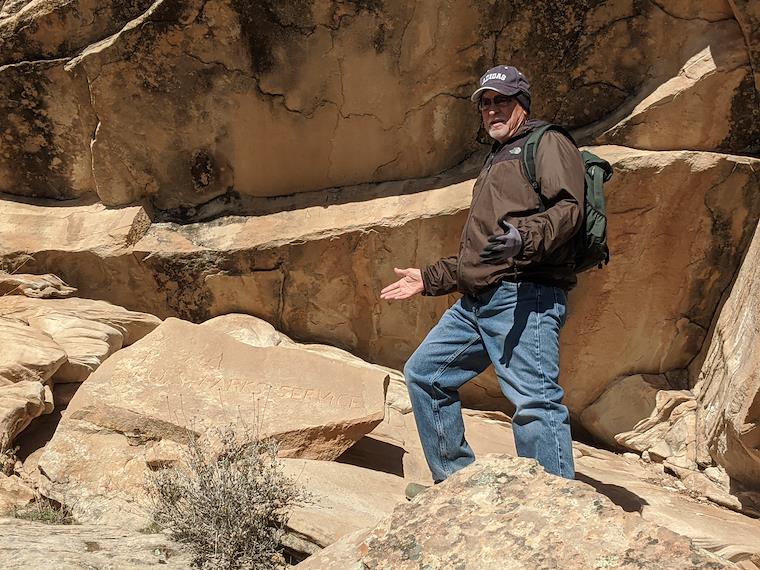 Kim leads a trail to the Kit Carson name carving