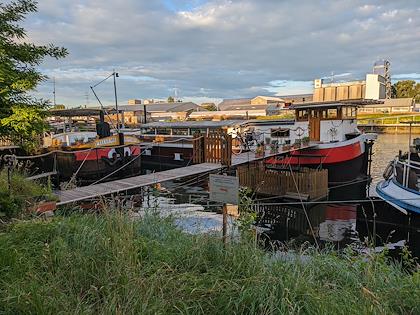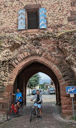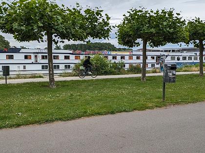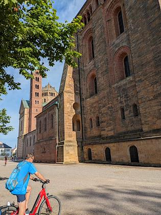 | Speyer to Mannheim Today, biking to Mannheim. In the morning before heading down the river, we first spent a little time biking around Speyer. It's particularly nice to bike around the main square, there are almost no cars and it's a beautiful spot, with the cathedral on one side and the old tower on the other. We looked for a few other sites, but either they were closed, or not that interesting. Another cathedral, a small archeological exhibit, and then we were on our way to Mannheim. Highlights of the ride - a nice bench on the side of the trail to eat our lunch (after breakfast, we pack some things from breakfast in our lunch container, either the provided bags or I have a plastic container with attached knife and fork). And the ferry, 1.50 to cross, a friendly Nigerian guy who was collecting the fares wished us well, he's been in Germany for 30 years. Then past the coal plant for Mannheim, and through a huge nature park (very smelly and muddy because of the recent flooding, white/gray mud everywhere), and then through the city, to the mooring spot for our boat the Olympia. It's always a relief to get on the boat, everything is clean and comfortable, and a known quantity. After a little rest, we went out into town. Mannheim does not have a lot of historical sites or anything, it's all industrial/commercial. We got a hair clip at Teddi, the dollar/discount store, then I got a few things at a grocery store, and also we found a sports shop where I got another bike lock, which makes 2. The owner of the used bike shop that we bought the bikes in warned us specifically about theft, said the cable lock we had was not much use. Just LAST WEEK he had had a bike stolen from right in front of his shop - the client had tried it out, and they were inside the store for a moment to discuss the bike, when someone came by and stole it. The owner ran after the thief, but couldn't catch him. Peter put his feet on his (plastic) chain guard on the bike, and broke it. We tried fixing it along the way with the silicone band of a bike lamp, but it kept working loose. So finally at the boat, we used some of the duct tape that I had brought to fix things up. Very handy! I've already used the duct tape to fix my knife sheath. It was a cheap knife I got at a discount store (Deux Euro store in Strasbourg), but I kept on not noticing that the see-through sheath was on it, and using it to spread butter, for instance, with the sheath on! So a little bit of duct tape made it visible, so I would remember to take it off. What else did we do in town... had some donner kebab, again. We've been doing that most days, to fill in gaps. Lots and lots of immigrants, at least in the area we were walking around. It reminded me of Germersheim, which was also mostly immigrants. Dinner was okay, there's usually a scramble on the part of the rest of the family to get at the foods that I leave behind (whatever doesn't fit in my carnivore plan). Especially dessert! I'm still doing pretty okay, for food, there's a fridge in the room (doesn't get very cold though) that I put some sausage, cheese, and butter in, so in case of emergency I can fall back on that. I asked them them to make an omlette for tomorrow night because the other options didn't work at all for me. Peter and Eric are playing a lot of cards - mostly rat-a-tat cat, but played with a standard set of cards, seems to work out okay. |  | |  | | Biking around the cathedral in Speyer. | | Lots of RVs have this type of roof over them, to make them semi-permanent |