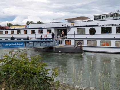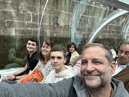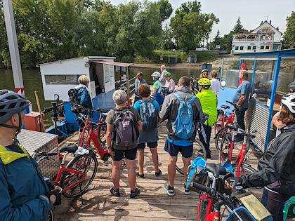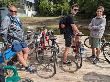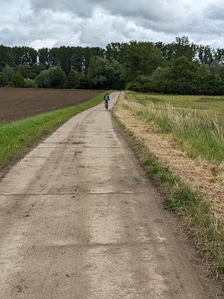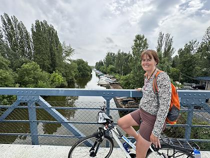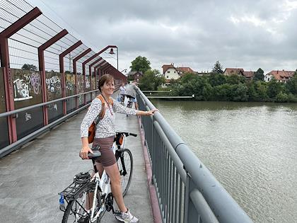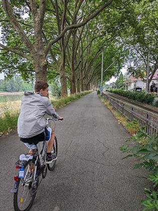 | Mannheim - Worms On the bike path today a little later, like 9.45 - we waited for a thunderstorm to pass. All worked out okay, we biked to the main trail and then got going along the riverside. There has been a lot of flooding, as I've mentioned before, but today the trails were really wet and muddy, and most importantly SLIPPERY in many places. In the very worst place, just a minute or so after I had alerted the rest of the family that the path was slippery, we came across a cluster of people from our boat, one of the gentleman had fallen down and was bleeding from his knee and hands, a little puddle had formed around his foot. Also along the trail we passed a lot of BASF factories (chemicals), took a ferry, biked along the top of a lot of dikes. Arriving in Worms, we had a little picnic at a table, then biked into town and to the cathedral (cathedrals are all starting to look the same). Later went to another kebab place (they are absolutely EVERYWHERE in Germany, there's no other restaurant that's more common). Then I found a EuroShop where I was able to buy one of those silicone phone holders that attach to your handlebar - very handy for navigating in a city, stops you from needing to stop and take out your phone all the time. Although not so good when you want to stop and take photos... But heading back to the boat, through the city, was very easy with the accessible navigation. Peter and Eric are playing cards a lot, rat-a-tat cat, with the regular playing cards (you can do that if you use the face cards as the special cards). Eric was even talking about creating a program to play rat-a-tat cat. Dinner on the boat, chatting a lot with our tablemates Lisa and Peka. He worked for Iceland Air a lot, went to Norway to study (had to learn Norwegian as he went), and now has a few busines ventures going, one of them in Dubai, I think. Very well traveled. Lisa had a career managing (or designing) restaurants. Now she's working for a company that does feed supplements for cattle. Or pets? Also the other Americans on the boat (Lisa and Joe from Seattle) are very business oriented and entrepreneurial, she does consulting (working for another company), market research for Google and Microsoft, and other companies. And he was previously an employee of the Seattle school district, in charge of finance. He was a former professor of finance or accounting or something at UW. I talked to him a bit about the broader economic situation, and what he thought. He thinks taxes should be higher. He's trying to get his son (getting a graduate degree in classical percussion) to learn some bookkeeping, so he has a "plan B" for his career. Evening - after dinner we all took a little walk into the near part of town, to a local grocery, I wanted to get some cream. That's my dessert, after missing out on all the desserts that are offered on the boat. I'm pretty sure the cream here is a lower milkfat that what I get in the US, it's much thinner. It says 30% on the package. One little approximately cup sized package for .99 euros. Then a magic show, run by the captain with some help from crew members. It was some fun schtick, lots of audience participation. The captain is a jovial guy but it doesn't seem like the magic show came naturally to him, I'm guessing that they're required to do a couple evenings of entertainment as part of the trip. Last night they had the traveling musicians on board, I heard from Josef that they travel around in an RV along the Rhine, doing entertainment specifically on the river cruise ships. Booked our first hotel, we're spending Saturday night in Mainz. That will be the beginning of the independent travel, for Peter and myself. |  | |  | | This part of the trail is okay, but many sections were slick and muddy, one person from our boat had a fall. | | A lot of bikers from our boat, crossing on the ferry |
