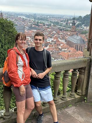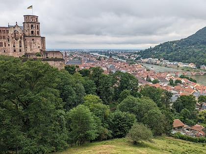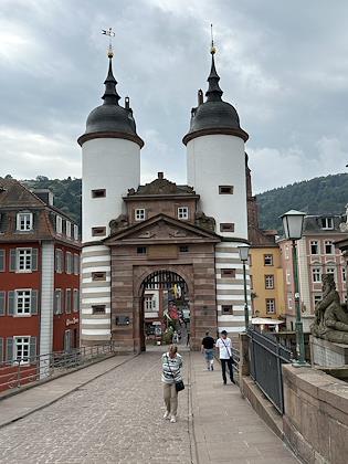 | Mannheim - Heidelberg - Mannheim A full day. We stayed moored in Mannheim, but changed the mooring location - that confused a lot of people, because the second location was hard to find. Biked into Heidelberg, which was the whole point of staying in Mannheim. We took the northern route, which goes into Landenberg, cute little city but unfortunately my chain came loose AGAIN, and this time before I was able to stop it, it actually broke a spoke. It's not something that will stop you, immediately, but apparently it does need to be fixed very soon, otherwise your tire gets unbalanced. As a matter of fact both Peter and Eric said that my tire was looking unbalanced (it was my back tire). So, first order of business in Heidelberg was not seeing the sights, but rather finding a bike repair shop. We called one (it seemed reasonable based on reviews) and they said to come on by. But then when we did, the guy said that they couldn't finish it today. However, there was another guy there, he seemed kind of like a customer or someone associated with the store. After I started talking to him a bit (like - does a broken spoke really need to be replaced right away, he said yes it does) and we got the "can't do it today" answer from the bike shop, he said maybe he could help us, and called a friend of his at another bike shop, who said they'd be able to fix it today. We biked there, they took it, and said they could finish it by 5, so that worked for us, plus they seemed very organized. In contrast, the first place that we went to...everyone there seemed a little off, like maybe they were volunteers, or apprentices from a bad technical college. By the way, the whole time biking to the first bike shop, the first few minutes there was a rainstorm threatening, and then it broke, pouring rain the whole bike ride there. I was completely soaked. We had lunch at the first reasonable place we came across (a Thai curry place run by a Vietnamese lady, in a shopping mall type place), then went up to the old castle. Great views. The rain had stopped a long time ago, and it was pleasant to walk around in the old castle grounds. So far Heidelberg is the first place we've been to that has any amount of American tourists at all. I heard American accents many times. Also there's lots of tourists from all other areas like Korea, India, etc. Then, back on the train instead of biking, just for a little break. But honestly I think the biking might have been slightly easier, because getting the train tickets was a hassle, as was finding out which track the train would leave from. There were NO information signs at all, nothing printed on our ticket. You just have to know, or use the app or something. I ended up asking a guy with a bike, who was luckily also headed to Mannheim, and led us to the right track, and the right car of the train. Only a 13 minute ride. Then back to the boat, and relaxing. No more going out tonight, there has been plenty of activity for one day. Kenny didn't end up going with us, he went on his own, early, got to the castle and then came back and relaxed the rest of the day. After dinner they had some entertainers on board - a couple that sang and played hits from the 60's and 70's. A lot of people danced - I did too! That was after the Italian lady, Rafaela invited me up. |  | |  | | | A bridge on the way to Heidelberg |