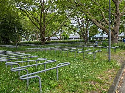 |  | |  | | A bike parking area of a school, unoccupied | | Looking up at Heidelberg Castle |