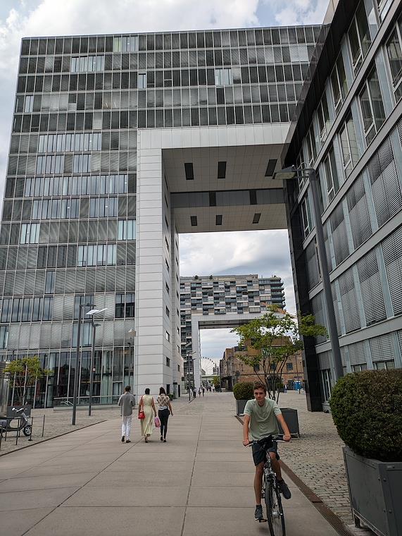 Biking into downtown Cologne, these are the Kranh�user (crane homes). Very interesting.