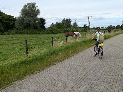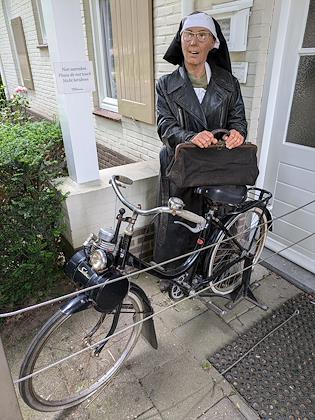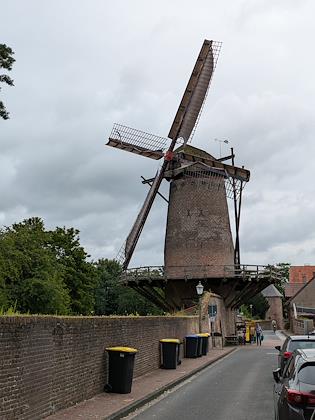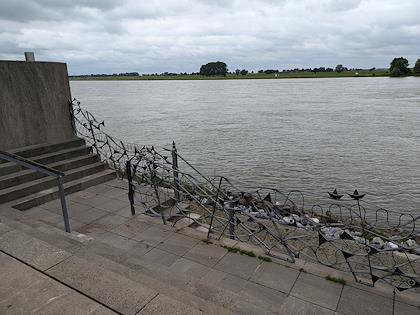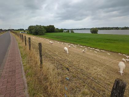 | Saturday, July 6th, 2024 - from Emmerich to Arnhem Another windy and kind of rainy day (not horribly rainy though), packed with experiences. A decent breakfast buffet at the hotel, I had 4 eggs and some of the cold cuts, as well as some milk. Biking out of town, we stopped at the Euroshop to pick up a small towel, because the hostel we're going to doesn't offer towels. (BTW the hostel turned out to be a really rotten deal, or else Holland is way, way more expensive than Germany). Then biking along roads and along dikes. The biking paths here are outstanding, of course, very nice and wide. Lots and lots of sheep. It was windy most of the time, but mostly NOT from a head-wind, rather a side wind, so it wasn't that bad. We had to take 2 ferries, our intermediate goal was Castle Doornenburg, which was more or less on the way. We got into the Netherlands, and stopped at a cafe, for Peter to get a celebration "new country" treat - he had cake and hot cocoa, and I had hot milk. Our immediate impressions of the Netherlands - people are much, much friendlier, and also happier. They talk more with each other, they say hello to us along the trail. I almost had more conversations today with people than the whole time we were in Germany. Granted, we went to a medieval/viking re-enactment festival at Castle Doornenburg, that's where I had most of the conversations. Also the Dutch are much, much taller than Germans. And more slender, and I really can't avoid the impression that they seem happier. We talked to one guy at length at the festival, he's a former cobblestone layer guy who now makes Viking era furniture - combination chest/bench things. He happily spoke the whole time in English. Then spoke to another lady (a teacher) who was working on a rabbit fur while talking, she makes things with them and sells them. She was talking a bit about all the anti-meat propaganda. You really do see MUCH more signage in restaurants, about vegan choices. Even at McDonalds, the vegan/fish choices are much more prominent than in the US - I'd say even more prominent here than the beef choices. Then into the castle courtyard. The festival extended there, with lots of kid-friendly things like juggling equipment, stilts, unicycles, little animal shaped carts that could be pushed around, a bubble machine, etc. Overall, really enjoyed the castle - even though we didn't actually go INTO the castle, because it turned out that we had tickets only for the festival, and not actually entering the castle. And it turns out that the castle was totally destroyed in WWII, and was rebuilt! So not original at all. It sure looks original, though. After that there was a long bike ride through the wind (usually not a head wind, but still) on top of dikes. Our hostel was up a long hill, and not central - tough at the end of the day. It's okay, but probably not the best deal. We rested a bit. I would have been happy to just stay in the hostel, frankly, maybe buy some food at the grocery store, but Peter wanted to go into down, so we did. Overall, it's cleaner and nicer than some of the German cities we've been to. The countryside is definitely very well tended, but in Arnhem we did see grafitti, etc. Anyway - the main thing we noticed was how very empty and deserted things were! I don't know why. Maybe a combination of the heavy winds, also the European Championship soccer game was happening and I think Holland was playing, maybe people stayed home for it. We went looking for a restaurant, and many were closed. Ended up at Burger King, I got 4 hamburger patties (no discount for just the patties, but at least I got them) and Peter got some cheeseburgers. Then biked up the hill (again!) stopping at a park so Peter could play clarinet. Whew. Long day. Packed with experiences. |  | |  | | Leaving Emmerich, heading to Arnhem. I spoke to an older man cleaning up this monument to an old railway bridge, long abandoned. | | A monument to a girl who died in a flood, after saving her mother and trying to save a mother with her children |