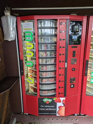 |  | |  | | Peter with a monster plant called Giant hogweed (Heracleum mantegazzianum), apparently very toxic to touch. | | In the Netherlands - people were suddenly very friendly after we'd crossed the border! A difference in national temperament, I guess. This is a strawberry/plum vending machine. |