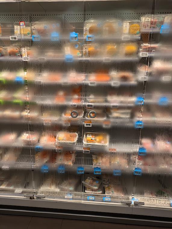 The refrigerated display shelves in the grocery store had a condensation problem. I'm sure it was because they used some very climate-friendly technology, but it was counterproductive because I needed to actually open a lot of doors to find what I needed.