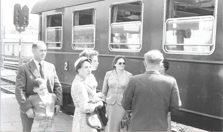 1957 July Leaving Austria to go to Canada. From the left, my maternal grandfather, my uncle Fritz, unknown woman, my aunt Elfriede, maternal grandmother, unknown person, my mother (half visible)