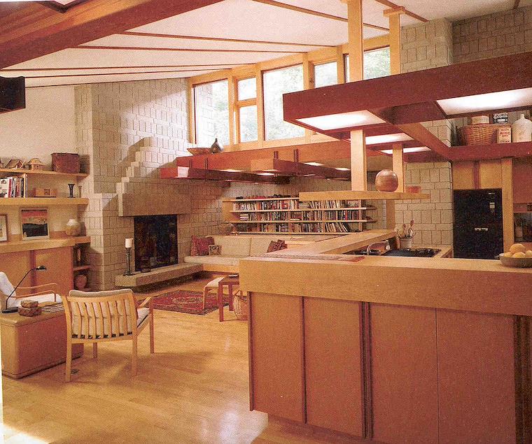 I like the big wall of seating area here, plus how the kitchen is enclosed yet overlooks the living area